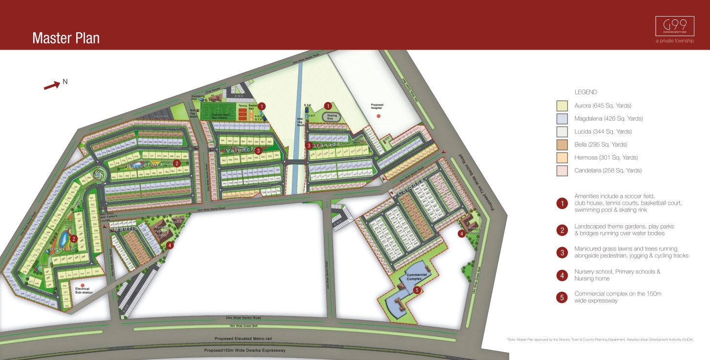 G99 has six exclusive gated residential communities built around a mile of green spaces and parks. The communities – Madrid, Seville, Barcelona, Valencia, Granada and Cordoba – are interspersed with schools, nursing home, commercial area and recreational facilities. Plots inside these secure gated communities are available in sizes ranging from 258 to 700 sq yards.